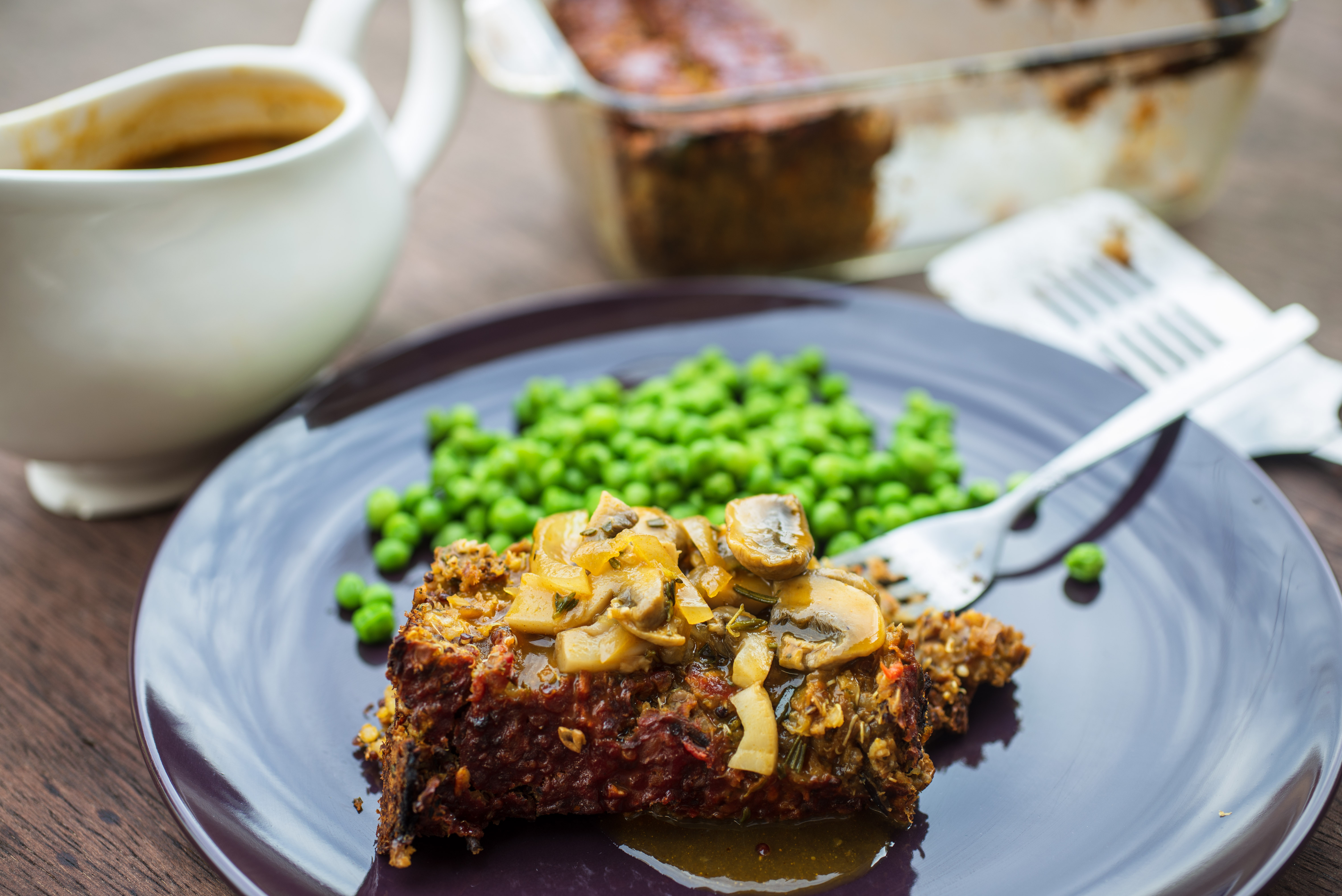 While the meatloaf is baking, sauté the sliced onions and season with salt and pepper. Cook until onions are translucent and caramelized. Next, add the mushrooms and herbs, and season with salt and pepper. Cook the mushrooms until they start to release their liquid and become tender. Add 2 cups of vegetable broth and bring to a simmer. Mix the corn starch in the remaining cup of vegetable broth and add it to the mixture. Stir and simmer for 10 more minutes or until the gravy thickens a little bit. This is not a very thick gravy.