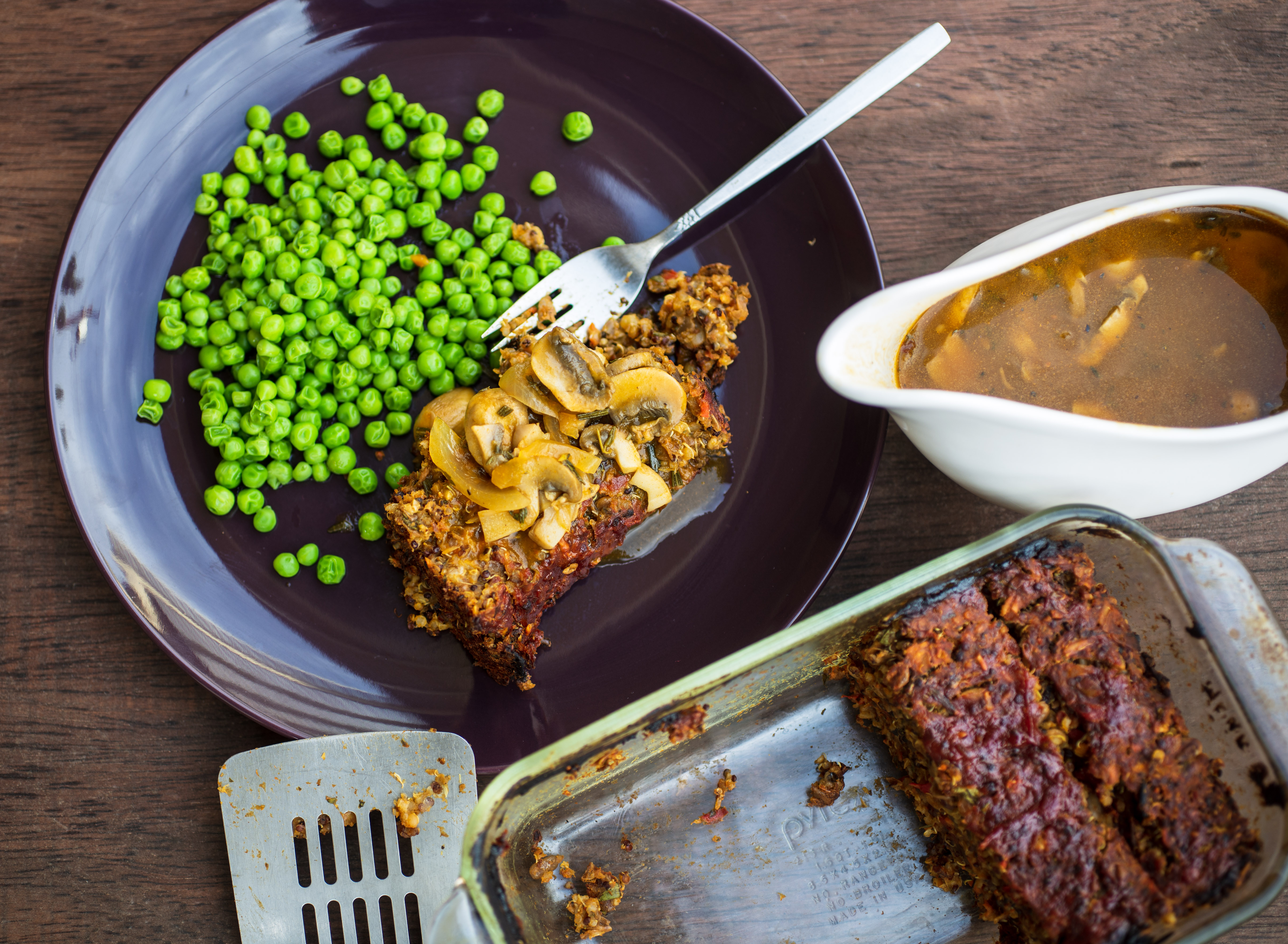 One of my favorite comfort foods is meatloaf and I have to admit, this “meatloaf” does not taste like a real meatloaf but it’s really good, as good as vegan meatloaf gets! It’s a great way to use leftovers and because it’s very starchy with all the rice, oats, etc. I decided to skip the mashed potatoes. The mushroom gravy is delicious, with an earthy herbal undertone. I think it would work as soup too, but that’s just my thought because I love mushrooms. So I present to you my vegan meatloaf, made with cooked leftover grains. The perfect Sunday supper à la Daniel Fast.